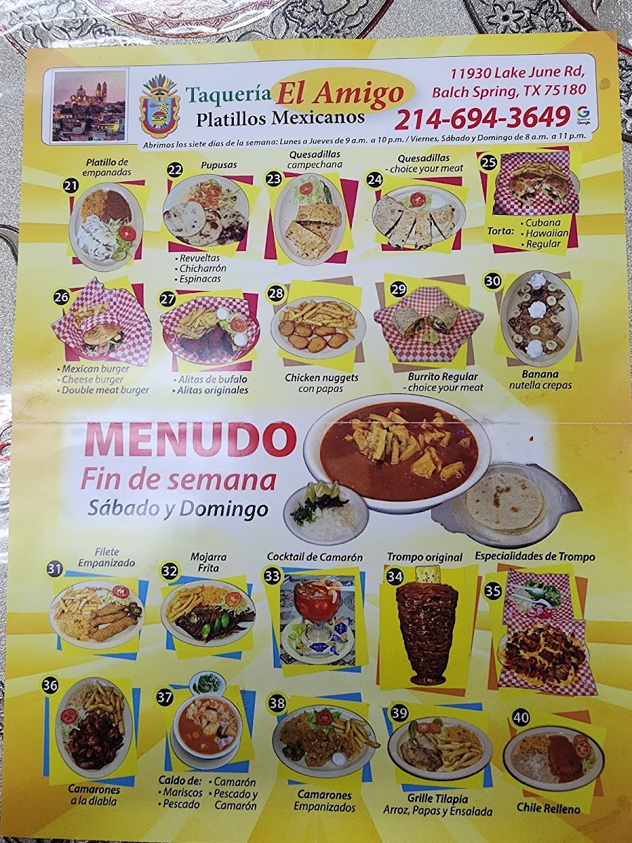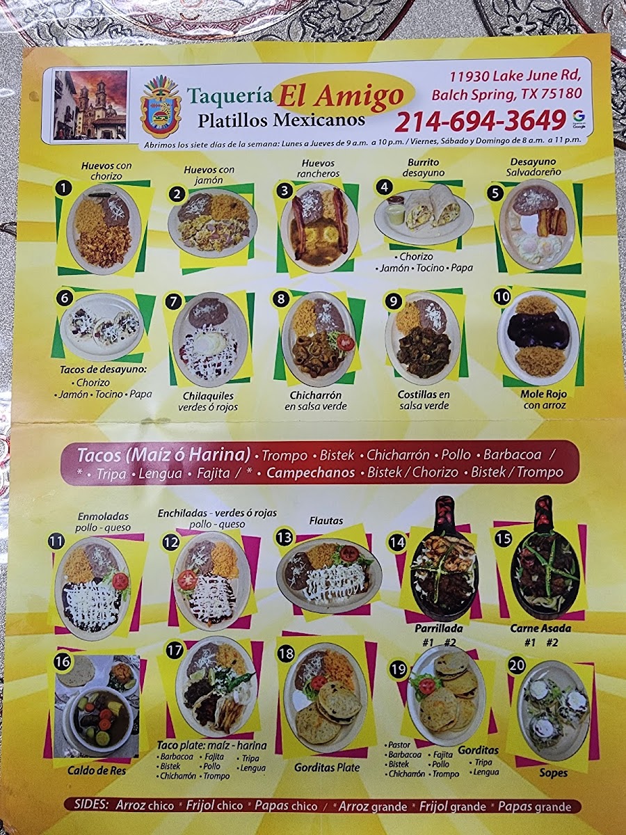 Welcome to Taqueria El Amigo - Balch Springs, a hidden gem located at 11930 Lake June Rd. This corner taqueria offers a delightful menu that captures the heart and soul of authentic Mexican cuisine. Diners rave about the tacos, with highlights including the tacos de tripa dorados, which promise a crunchy, flavorful bite, and tacos de lengua, renowned for their tender, juicy richness. Each taco is enhanced with grilled onions, fresh cilantro, and fiery grilled Serrano peppers, paired perfectly with house-made green and red salsas.